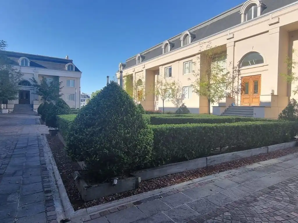 Ingreso al complejo a través de jardines parquizados con estilo parisino.