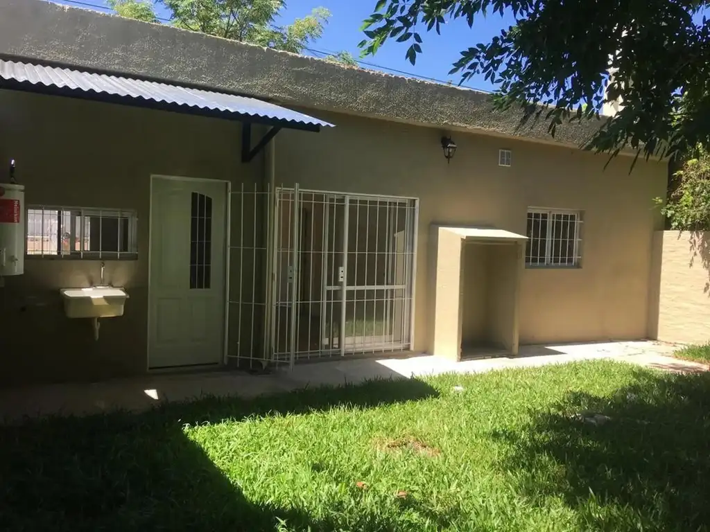 Jardín al frente y espacio guardacoche con portón de reja. Living comedor con salamandra y ventilador de techo con salida por puerta balcón a jardín trasero; cocina family comedor diario con ventilador de techo y artefactos lumínicos modernos, con salida también a jardín trasero por puerta independiente, con mesada de mármol, cocina, bajo mesada y alacena en altura; toilette; dos dormitorios en semi suite con ventiladores de techo que comparten un baño completo; jardín al fondo con árboles, amplia parrilla, lavadero semicubierto.