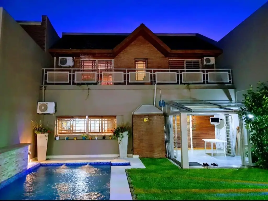 JARDIN CON PISCINA Y QUINCHO DE DOS PISOS CON PARRILLA, TOILETTE Y ENTRADA DE AUTOS POR CALLE BAUNES, EN PRIMER PISO PLAYROOM CON BAÑO COMPLETO Y PLACARD