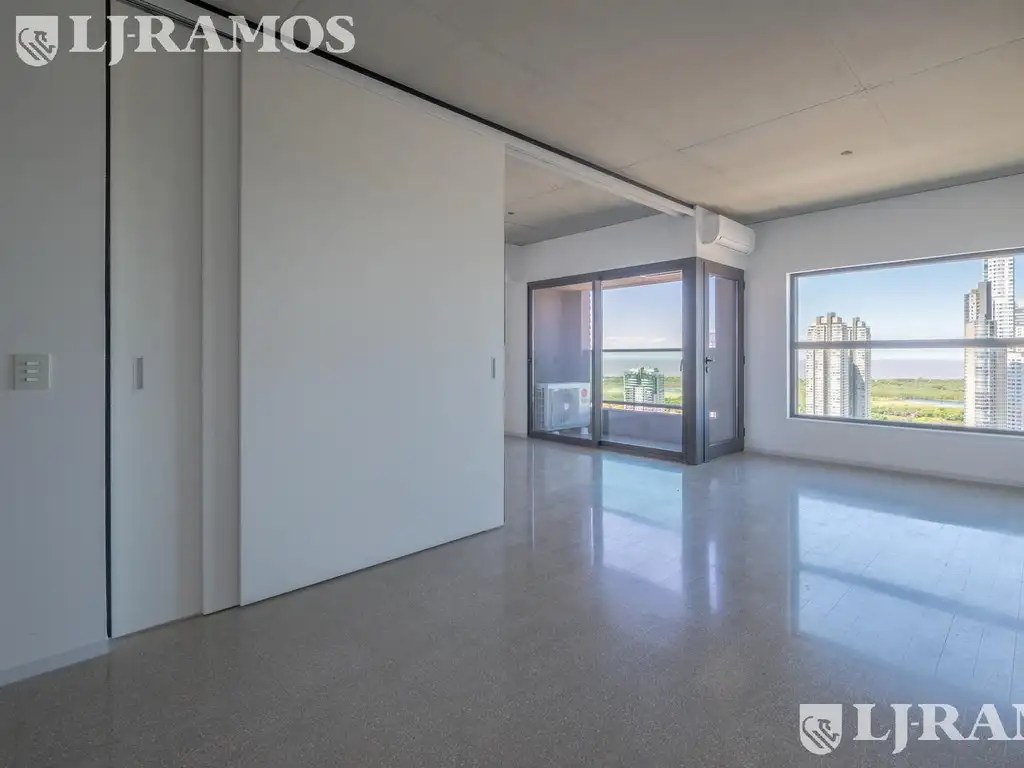 Dormitorio en suit con salida a balcón, living y dormitorio ambos dan a un gran ventanal apaisado de piso a techo, con vistas abiertas increíbles. Piso muy alto de la torre.