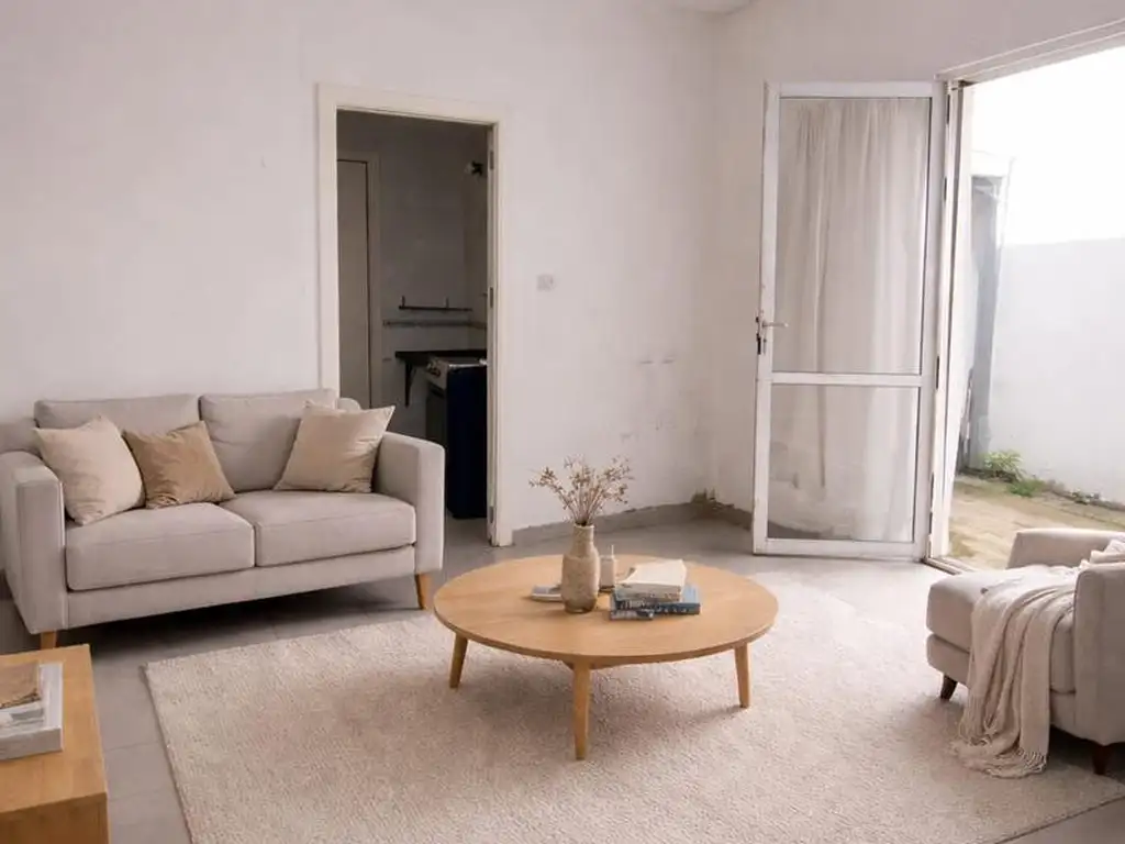 HOME STAGING VIRTUAL: La primera foto corresponde a la propuesta de muebles y reciclado virtuales para que el cliente pueda considerar la potencialidad del espacio. A continuación se muestran las imágenes reales actuales, con y sin muebles, con y sin home staging virtual.