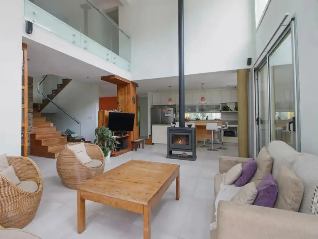 Amplio living-comedor con doble altura y cocina integrada con isla, que ofrece acceso a una cómoda galería equipada con parrilla moderna a leña y a gas de acero inoxidable.