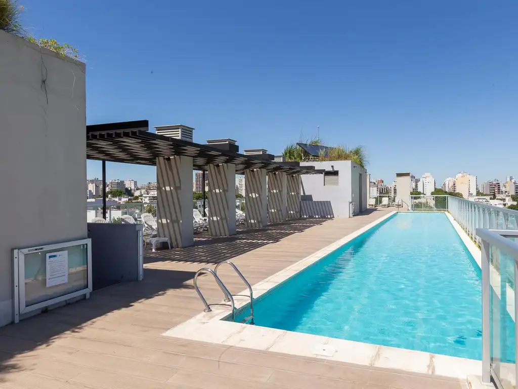 Pileta de 25 metros de largo en la terraza con solárium, vestuarios y baños.