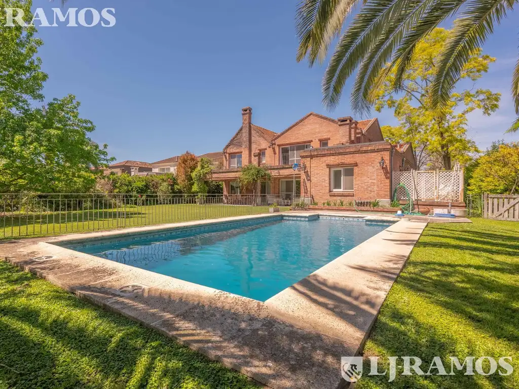 En el exterior: amplia galería con sectores de living y comedor, parrilla con brasero, vestuario con baño, gran pileta con solárium, pérgolas para cuatro autos y jardín parquizado con riego automático.