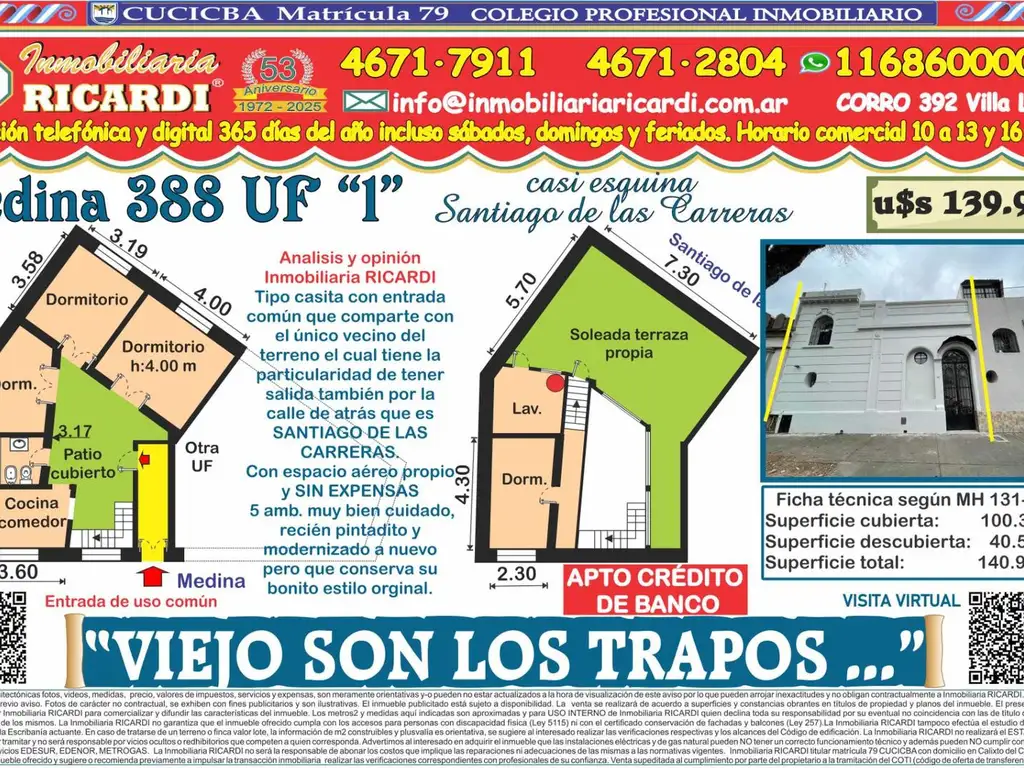 El inmueble publicitado se encuentra está sujeto a disponibilidad y la Inmobiliaria RICARDI actúa como comercializador del inmueble., siendo bajo responsabilidad del propietario la tramitación del COTI.