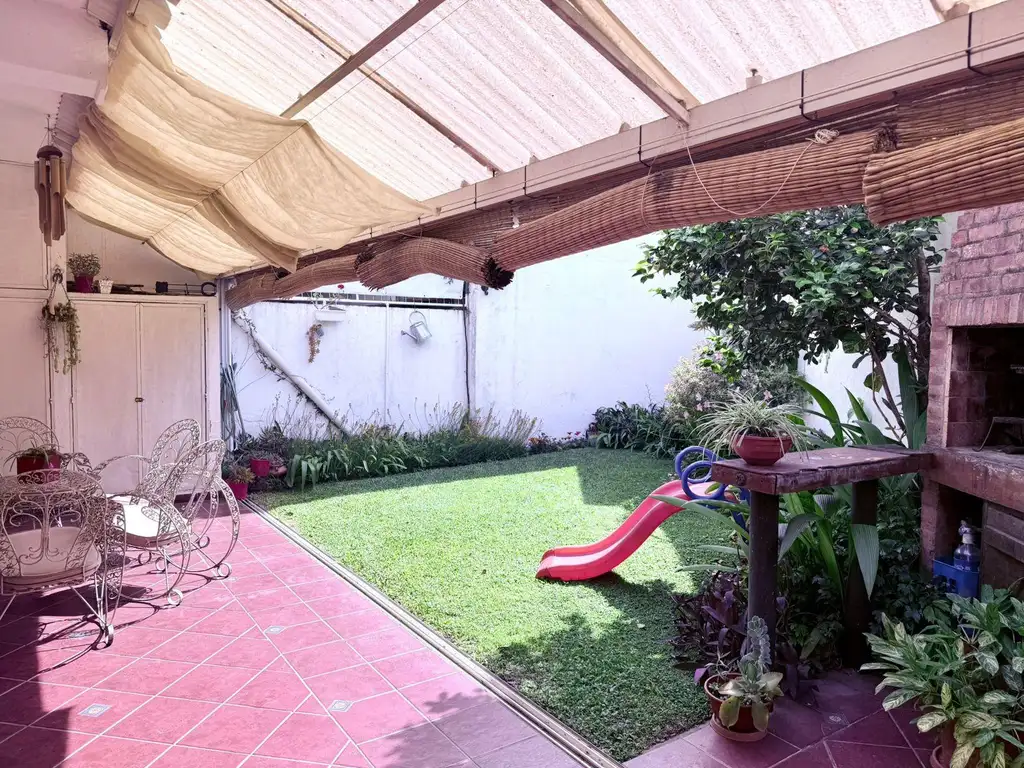 El fondo está diseñado para disfrutar: cuenta con sector parquizado con césped y plantas, gran parrilla y patio semicubierto con policarbonato, muebles de guardado al lateral y piso de baldosas, ideal para reuniones al aire libre, con salida al pulmón de manzana que brinda aire y tranquilidad.