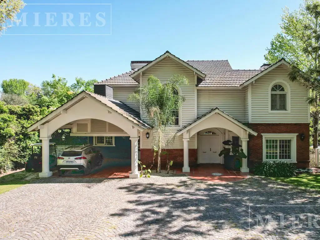 Planta baja: hall de entrada con toilette de recepción. Escritorio con baño completo. Living con hogar, comedor con salida a la galería y vista al jardín. Cocina con lavadero, despensas y dependencias de servicio. Importante playroom con chimenea.