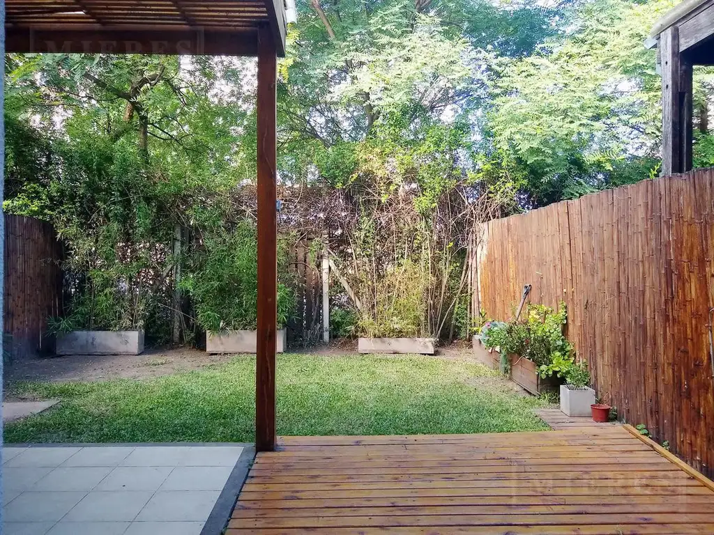 Exterior: Galería con parrilla. Jardín.