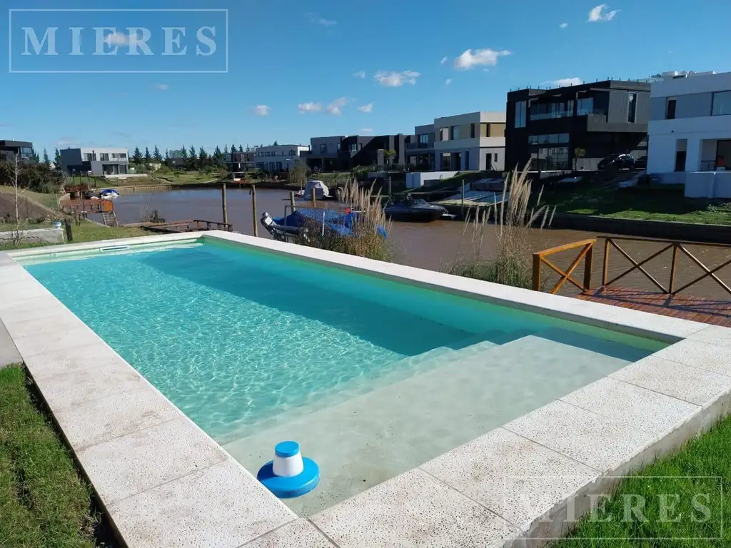 Exterior: jardín con galería techada, parrilla, pileta y Muelle al Rio.