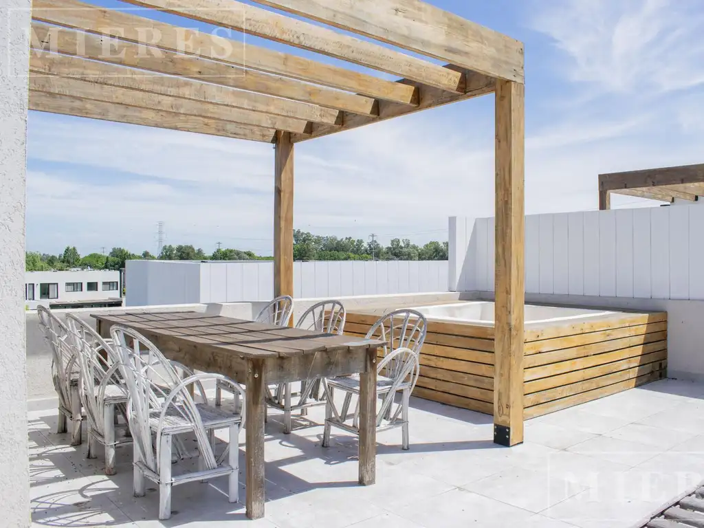 Exterior: balcón. Terraza con parrilla y pileta. Dos cocheras.