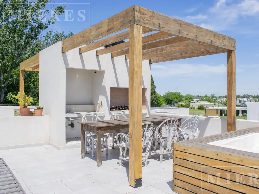 Exterior: balcón. Terraza con parrilla y pileta. Dos cocheras.