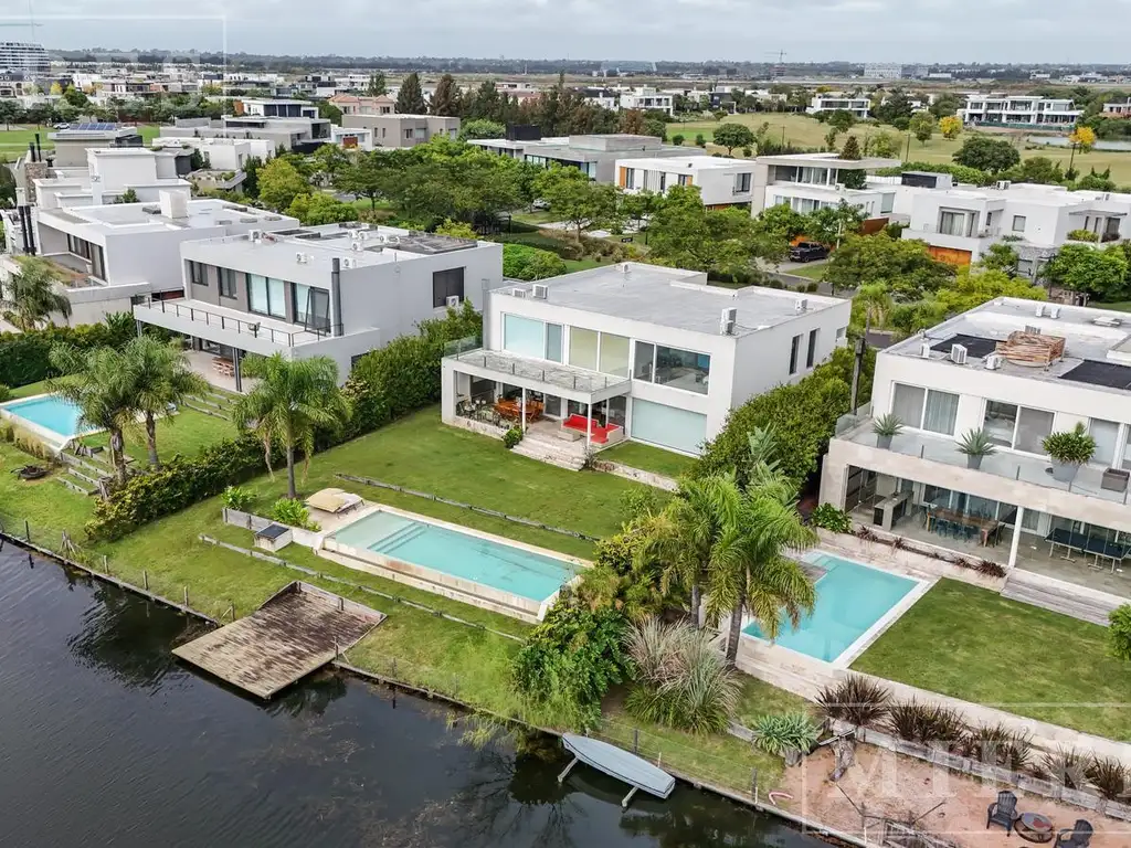Exterior: Galería techada con parrilla con cerramiento. Jardín parquizado con riego automático. Pileta con desborde infinito. Solárium y Muelle al lago central.