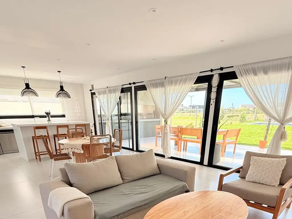 La casa se desarrolla en una planta, sobre 190m2 totales en un lote de 800m2 que se encuentra perimetral a la calle principal del Barrio.