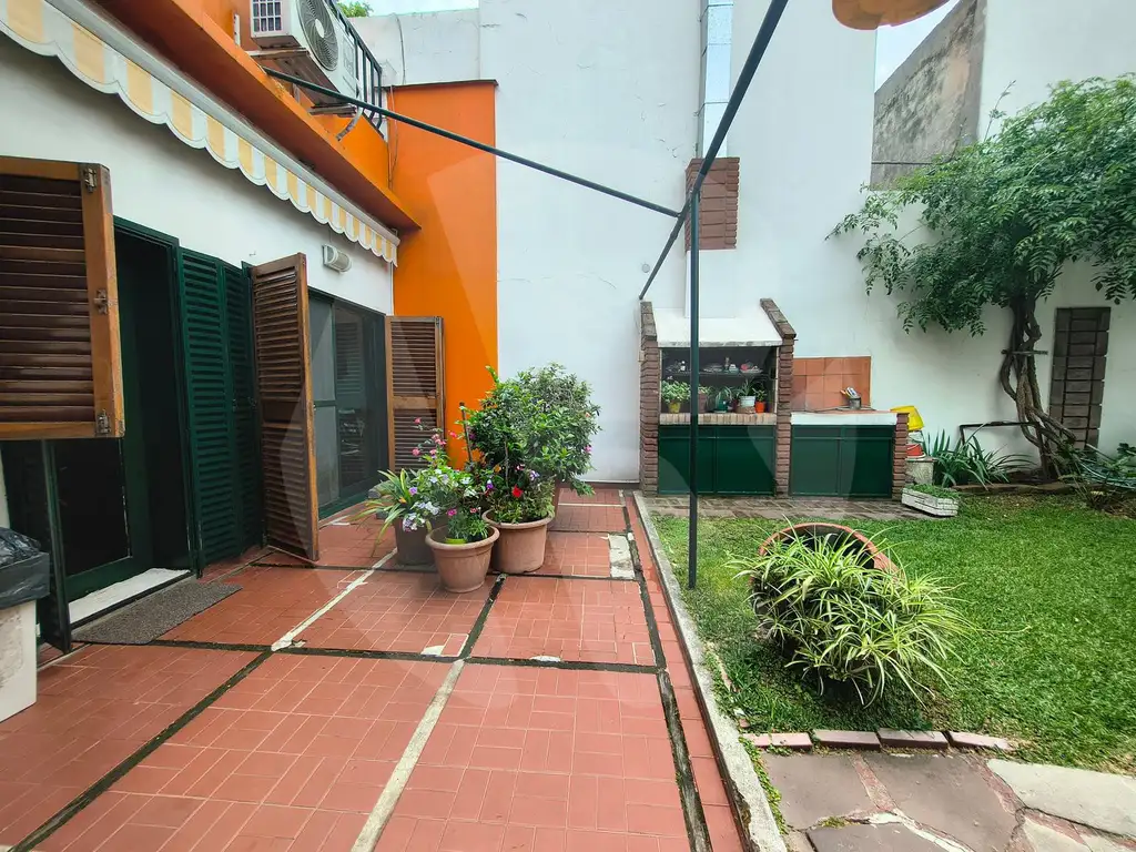 Jardín parquizado con parrilla, toldo retráctil y acceso directo desde la cocina y el escritorio.