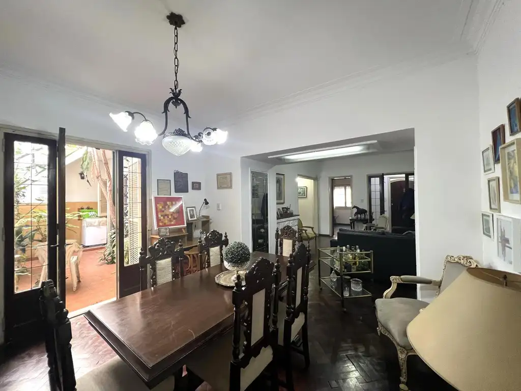 con un hogar. Salida a un lindo y luminoso patio descubierto con acceso por escalera a planta alta donde encontramos una terraza chica donde hay una habitación y baño de servicio. Por otro tramo de escalera se accede a una terraza con parrillero. Baño de recepción. Cocina independiente con espacio para comedor diario. La cocina se encuentra totalmente equipada, gran lugar de guardado: con amoblamiento de bajo mesada y alacenas en madera, bacha doble de acero inoxidable con mesada de mármol. Lavadero independiente.