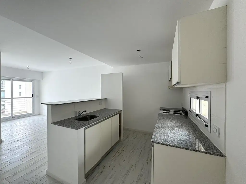 Ingreso a cocina semi integrada con mesada de mármol, alacena y bajo mesada, placard en el ingreso donde esta el termotanque y la instalación de lavarropa para que quede todo oculto. Baño completo con ducha. Las unidades tienen aberturas de muy buena calidad, con DVH y persianas eléctricas.
