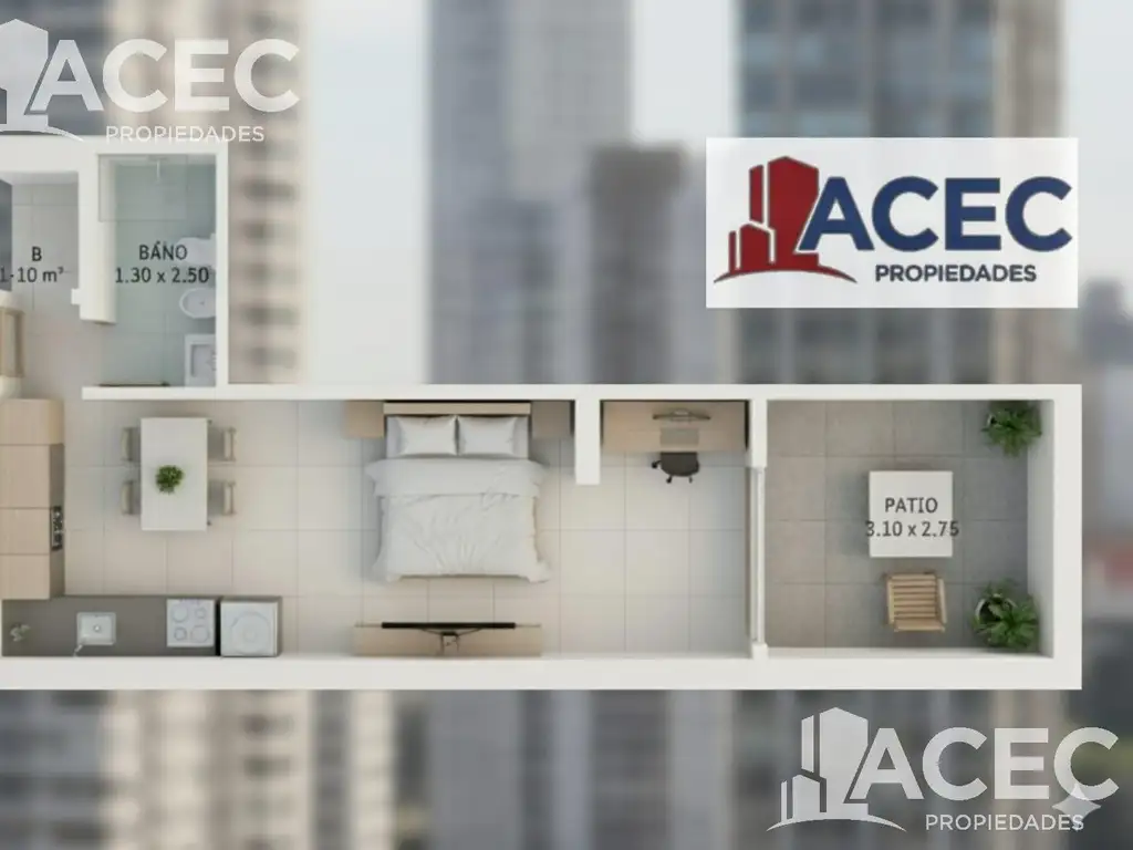 . Su amplitud permite definir claramente las zonas. Puedes tener tu rincón de trabajo o estudio (como se ve en el plano) y un cómodo sector para el descanso y el entretenimiento. Directamente desde éste ambiente, acceda a un encantador patio, el lugar perfecto para relajarse y disfrutar del aire libre.