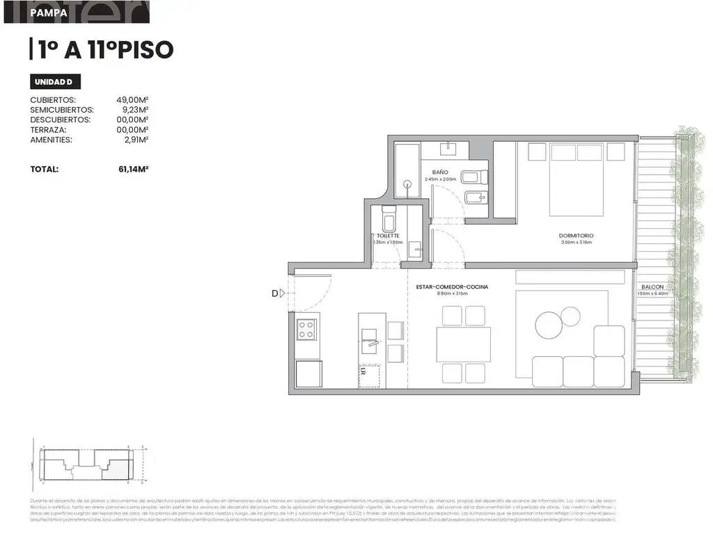 Todas las imágenes, planos, descripciones, y características indicadas son meramente referenciales e ilustrativas y podrán ser modificadas sin previo aviso. Las superficies indicadas son estimadas. Las superficies y medidas definitivas surgirán del plano de mensura final aprobado oportunamente por el GCBA. Las fechas de inicio de obra o posesión son estimadas, podrán ser reprogramadas por la Dirección de obra y dependerán a su vez de un proceso de aprobaciones municipales u otros organismos intervinientes. Los precios indicados podrán modificarse sin previo aviso. El interesado deberá realizar las verificaciones respectivas previamente a la realización de cualquier operación, requiriendo por sí o sus profesionales las copias necesarias de la documentación que corresponda.