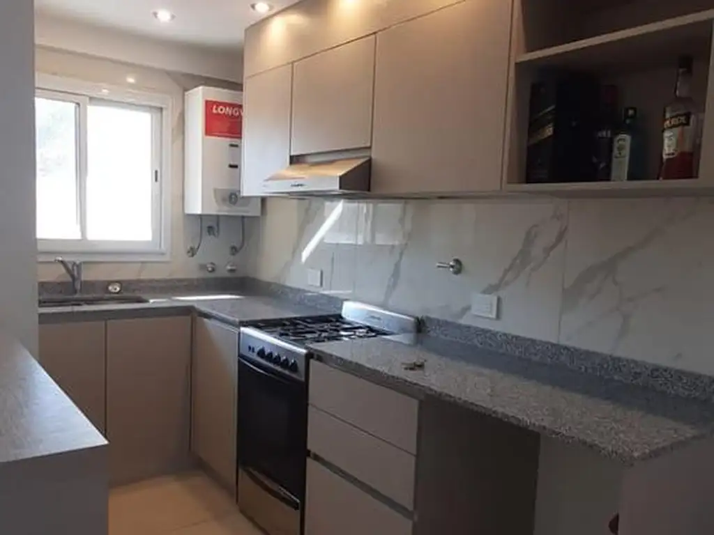 Ubicado en un primer piso al contrafrente. Living comedor integrado a la cocina a través de una isla. Con muebles altos y bajos con sistema cierra suave y correderas telescópicas y pisos de porcelanato.