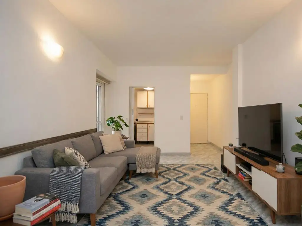 Amplio living comedor con luz y salida a pequeño patio.