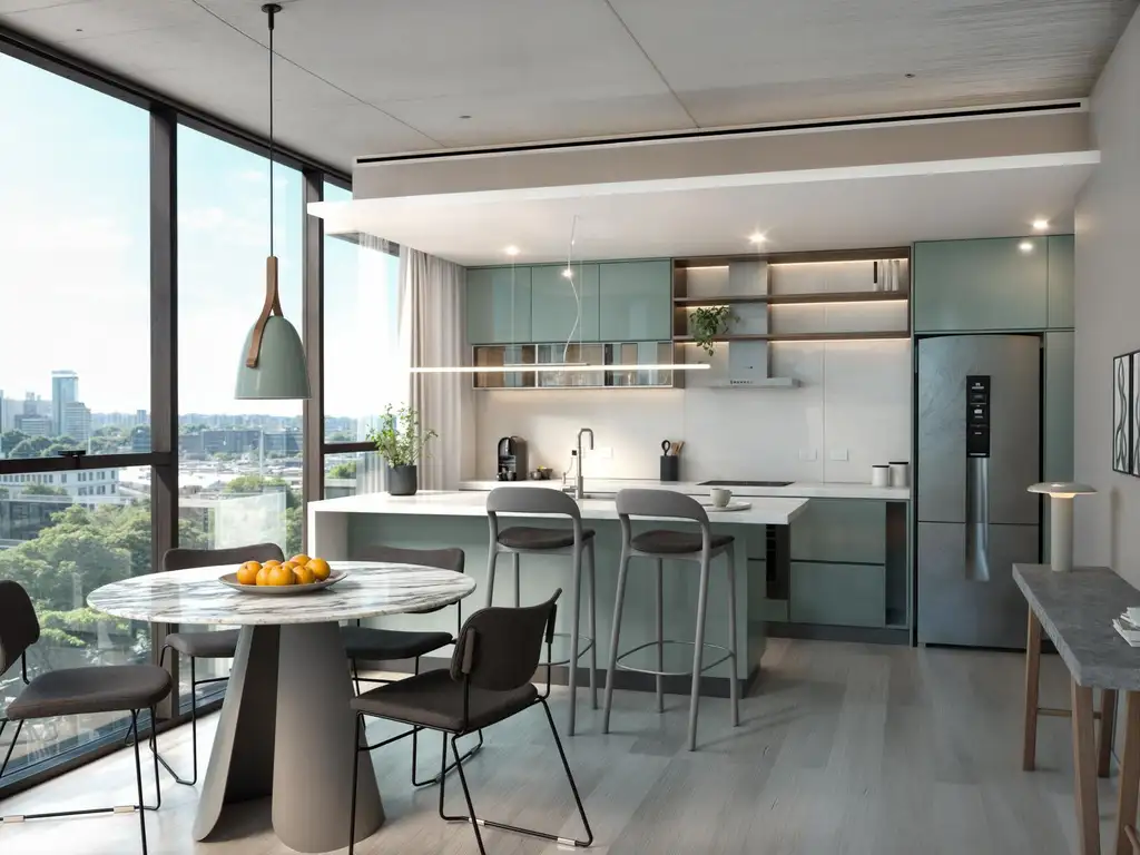Con un frente de más de 60 metros, el edificio se eleva en Planta Baja + 14 pisos, integrando residencias de 1, 2, 3 y 4 ambientes de 50 a 162 m2, un apart hotel, oficinas, un amplio espacio gastronómico de más de 600 m2 y su propio estacionamiento comercial. Las unidades presentan detalles de diseño contemporáneo, losas de hormigón a la vista y materiales de calidad: mesadas de Silestone en baños y cocina, extracción dedicada, puertas en 2,3 m de altura y equipo BGH BAMBú MINI VRF centralizado para el acondicionamiento de aire. Los cerramientos en aluminio negro con cristales DVH complementan el diseño, ofreciendo aislamiento térmico y acústico.