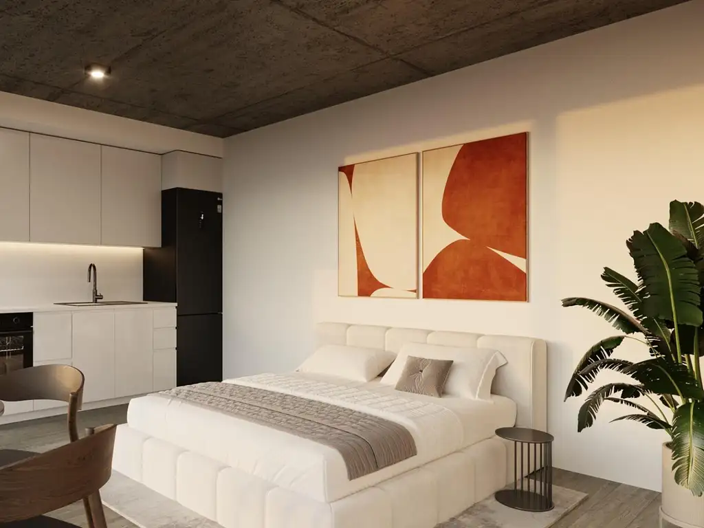 Cocina con muebles de diseño escandinavo, mesadas de Silestone o similar y alzada de Coverglass.