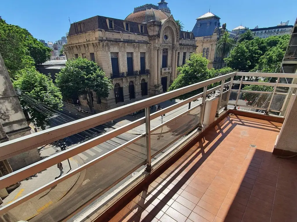 Living-comedor en esquina, de gran tamaño, con balcón corrido sobre calles Córdoba y Balcarce.