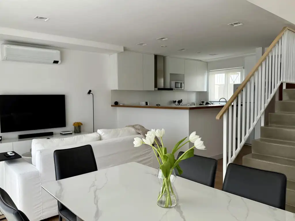 La calefacción es por losa radiante, y cuenta con 4 unidades de refrigeración tipo split SAMSUNG; uno en cada habitación y uno en planta baja. Horno eléctrico, anafe eléctrico a inducción, pisos de porcelanato ILVA simil madera. Mesadas de cocina y baño en cuarzo. Ventanas en pvc con doble vidrio.