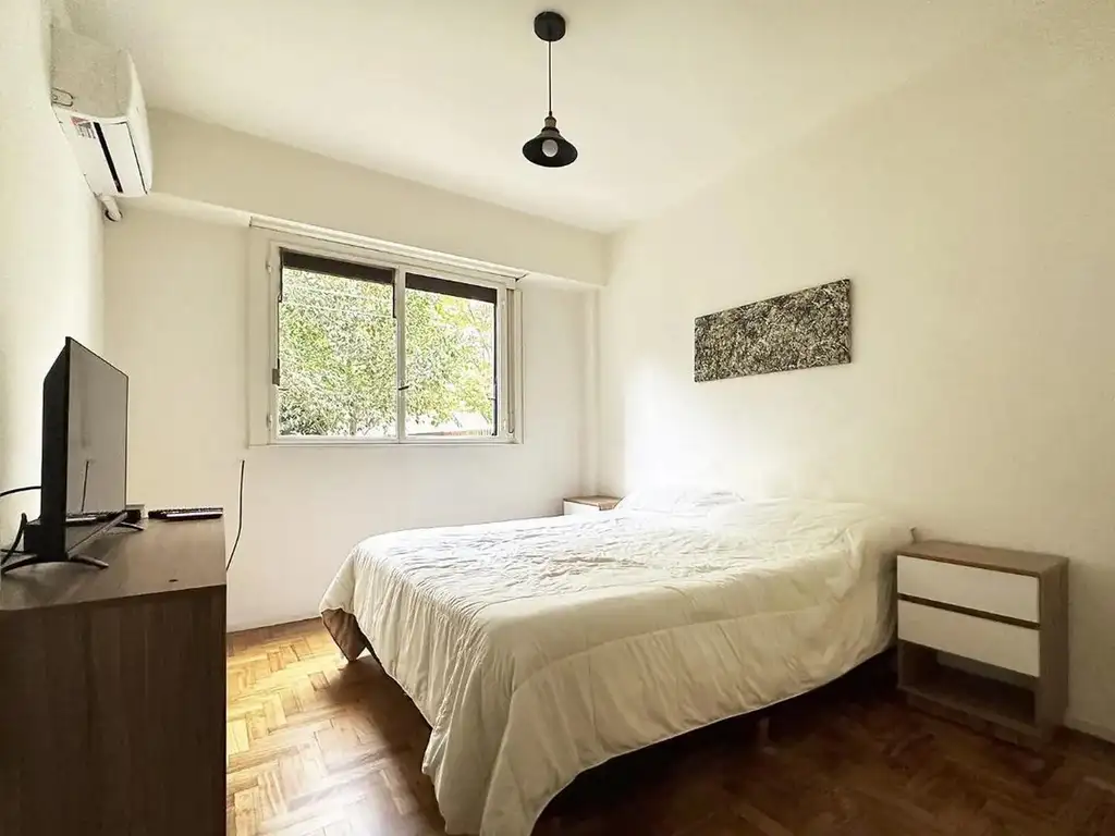 Pisos de madera. Living comedor. Balcón aterrazado con vista a jardín. Todos los ambientes dan al exterior, al contrafrente. Cama doble en dormitorio principal + 2 camas singles en segundo dormitorio (una cama se saca debajo de la otra) con escritorio. Amplios placares.