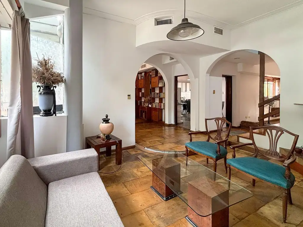 Ingreso principal con acceso a hall exterior que conecta directamente con un ambiente, donde se encuentra el espacio de biblioteca por un lado y el living con hogar a leño por el otro. Este gran ambiente es muy luminoso y ventilado, gracias a sus ventanales, que cuentan con persianas y rejas, que dan al frente de la propiedad con orientación Oeste.