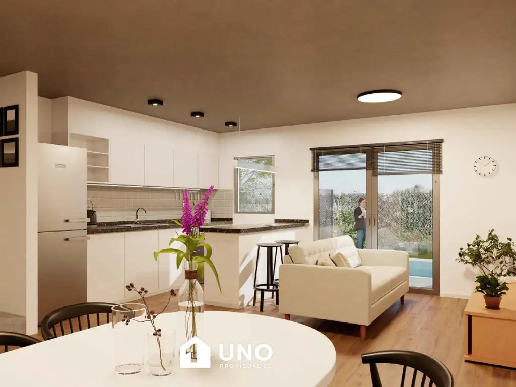 En planta baja dispone de un jardín delantero con espacio para estacionar, amplio estar/comedor, cocina integrada con conexión para lavarropas, toilette y patio de uso exclusivo con césped, parrillero y pileta.