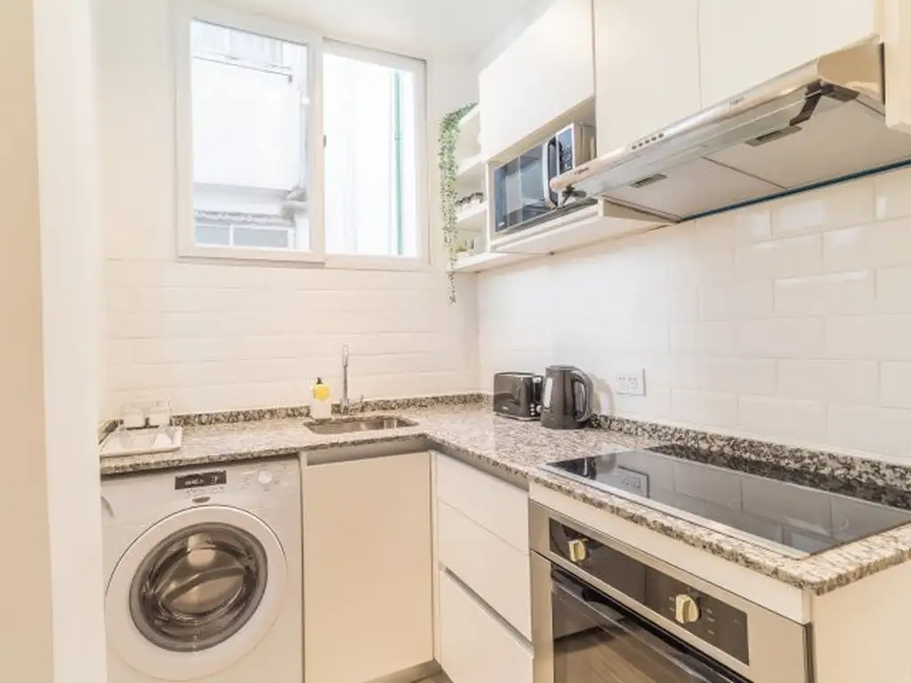 Cocina equipada con anafe vitrocerámico, horno empotrado Atma, microondas Atma, heladera y lavarropas Dream 7,5 kg. Termotanque Philips 80 L.