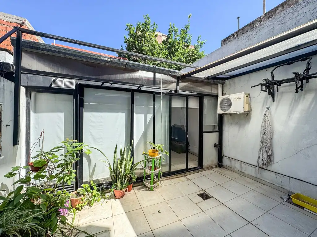 El departamento cuenta con cocina al ingreso, un patio cerrado que se utiliza de comodín, living- comedor y dormitorio con salida al patio. Continuando tenemos un quincho de uso exclusivo con parrillero y toilette completo. Cochera en el edificio incluida en el valor .