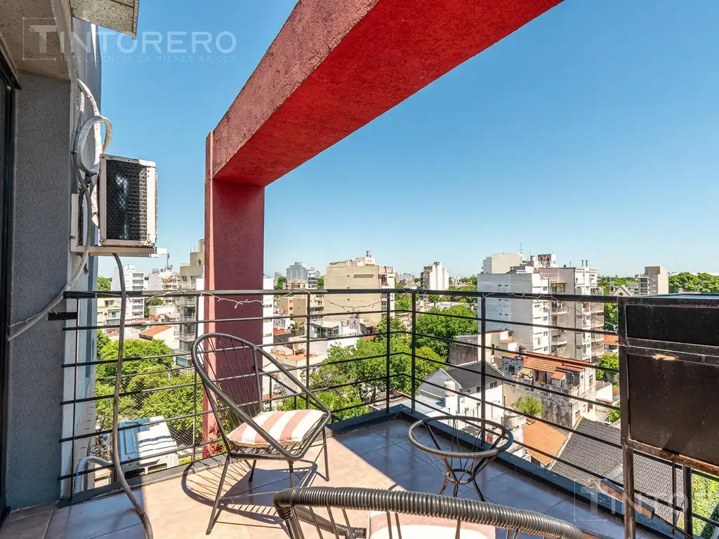 Departamento de un ambiente ubicado en el último piso del edificio, con vista al frente y un balcón terraza de gran superficie.La disposición del ambiente permite proyectar una división para conformar un espacio de descanso independiente, manteniendo buena circulación y entrada de luz natural gracias a su orientación y a la apertura del balcón.