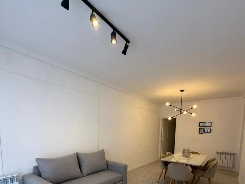 Amplio living comedor con balcón saliente a la calle y vista lateral a la plaza y al mar