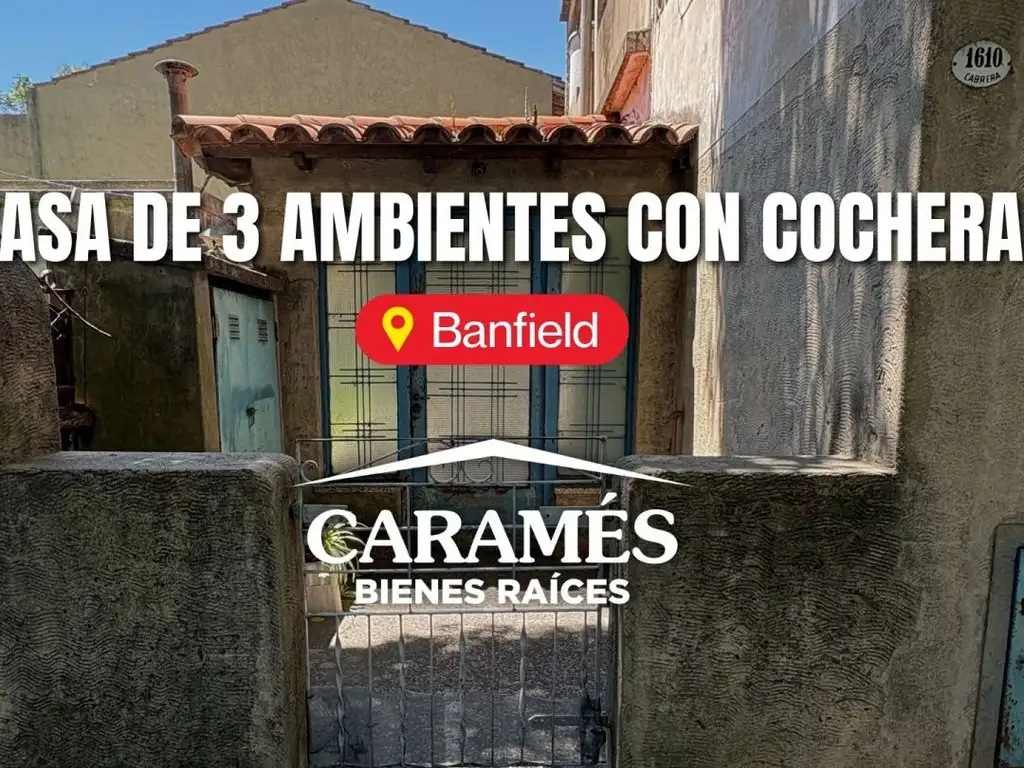 Venta ? Casa ? Banfield; 3 ambientes/2 dormitorios/1 baño.Superficie 190 m² cubiertos/120 m² libres/310 m² totales.Cocina separada, living, patio con jardín, terraza accesible y parrilla; orientación este.Cochera.