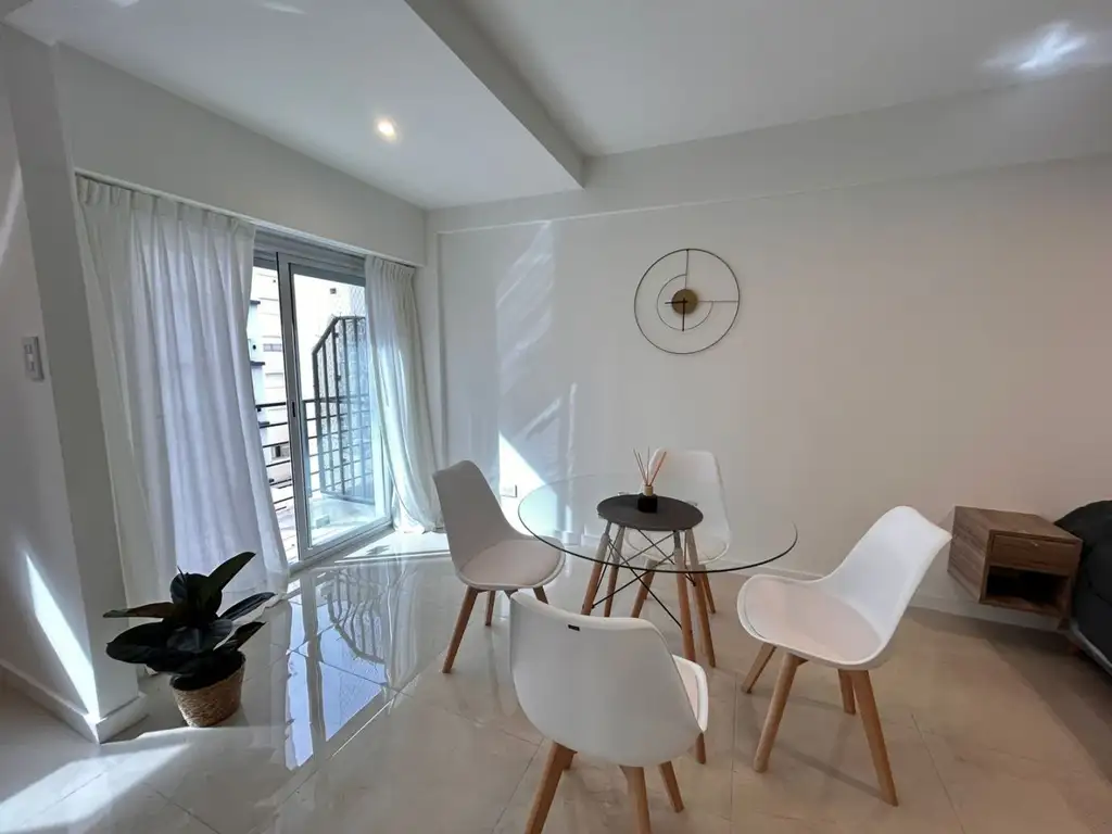 Ambiente amplio a la calle con amplio ventanal y balcón saliente.