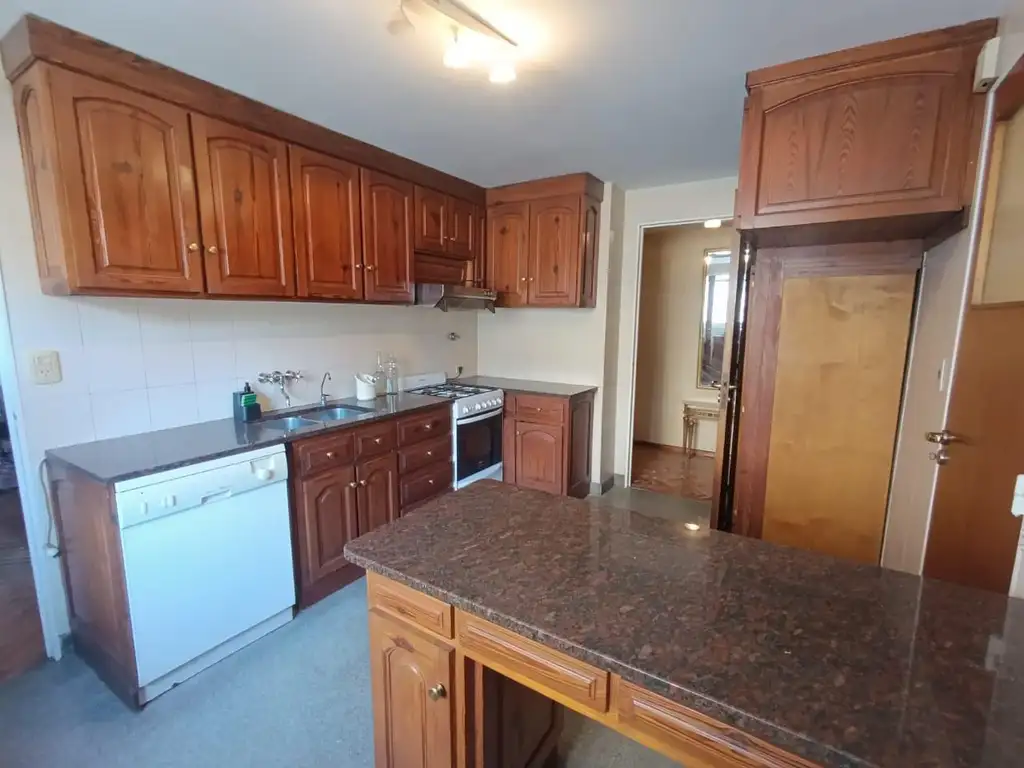 Posee en el lateral un comedor diario (separado mediante puerta corrediza de madera) con ventilación natural y allí encontramos el segundo acceso a la cocina también con ventilación natural en éste caso al norte. En el sector de la cocina, (con gran espacio de guardado, lugar para heladera y lavavajilla. Barra divisoria y todos los muebles de madera), tenemos un pasillo que conecta a la habitación de servicio que posee ventana al contrafrente, baño con pileta lavamanos, inodoro y ducha y la entrada secundaria al departamento también se encuentra en éste sector.