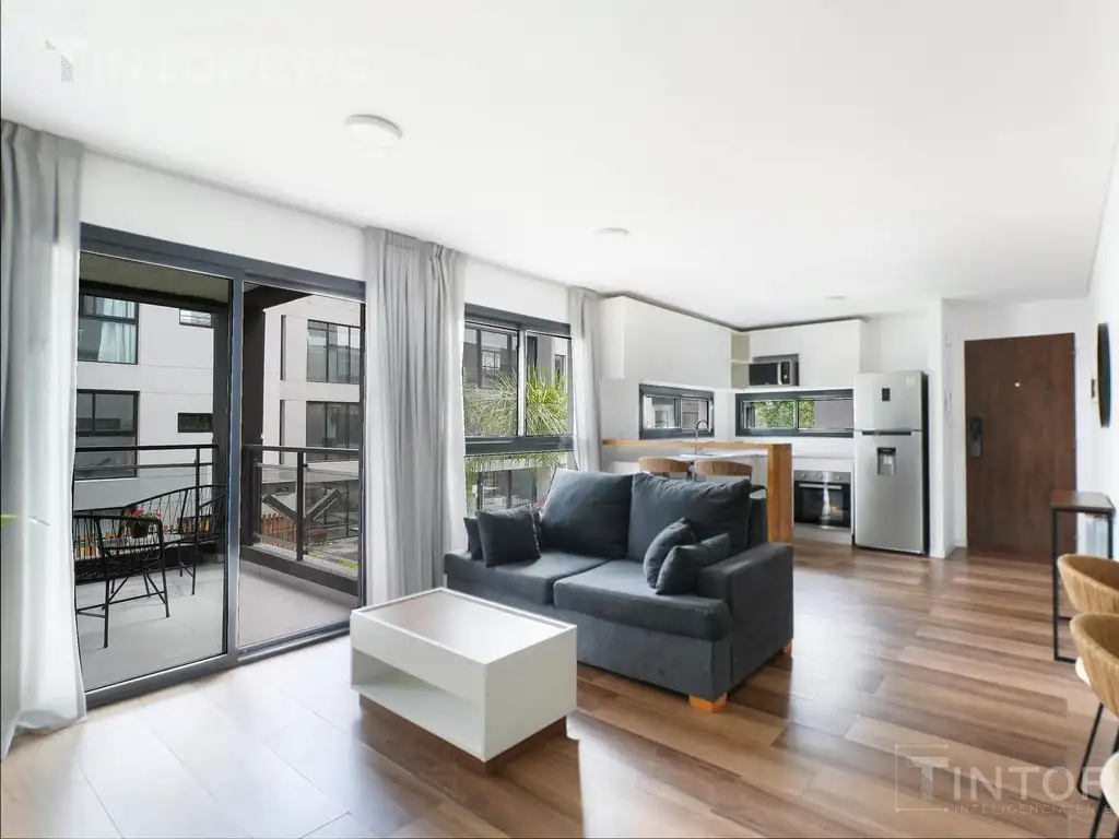 La cocina, equipada con muebles de alacena y bajo mesada, anafe eléctrico, horno empotrado, conexión para lavarropas y una barra desayunadora, se integra armónicamente y permite aprovechar al máximo cada metro. El ambiente cuenta con grandes ventanales que aportan luz natural, ventilación cruzada y acceso al balcón principal, ideal para disfrutar del aire libre sin salir de casa.