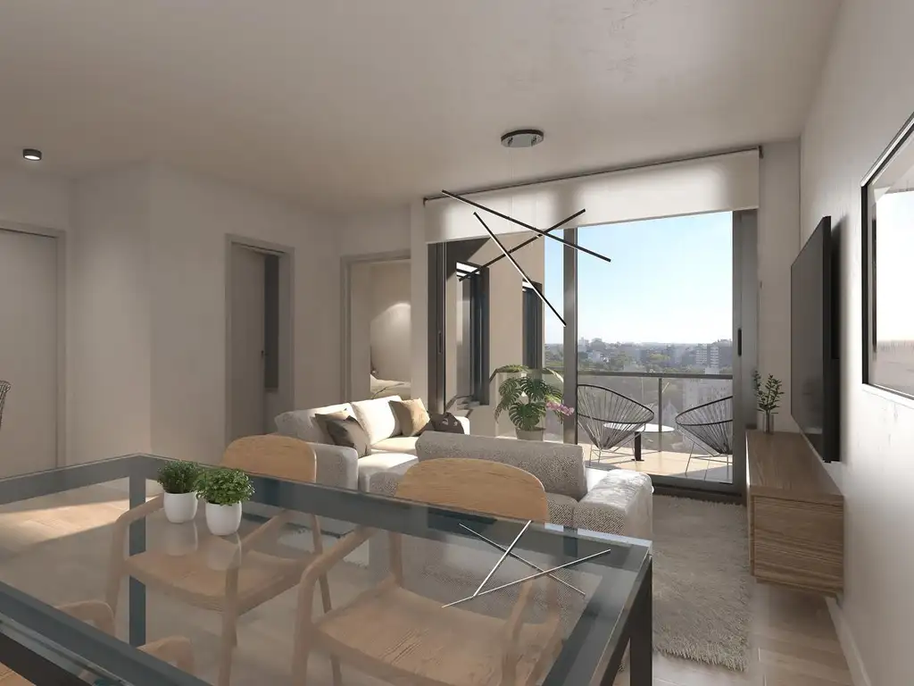 - Living comedor con cocina integrada, barra desayunadora e instalación para lavarropas