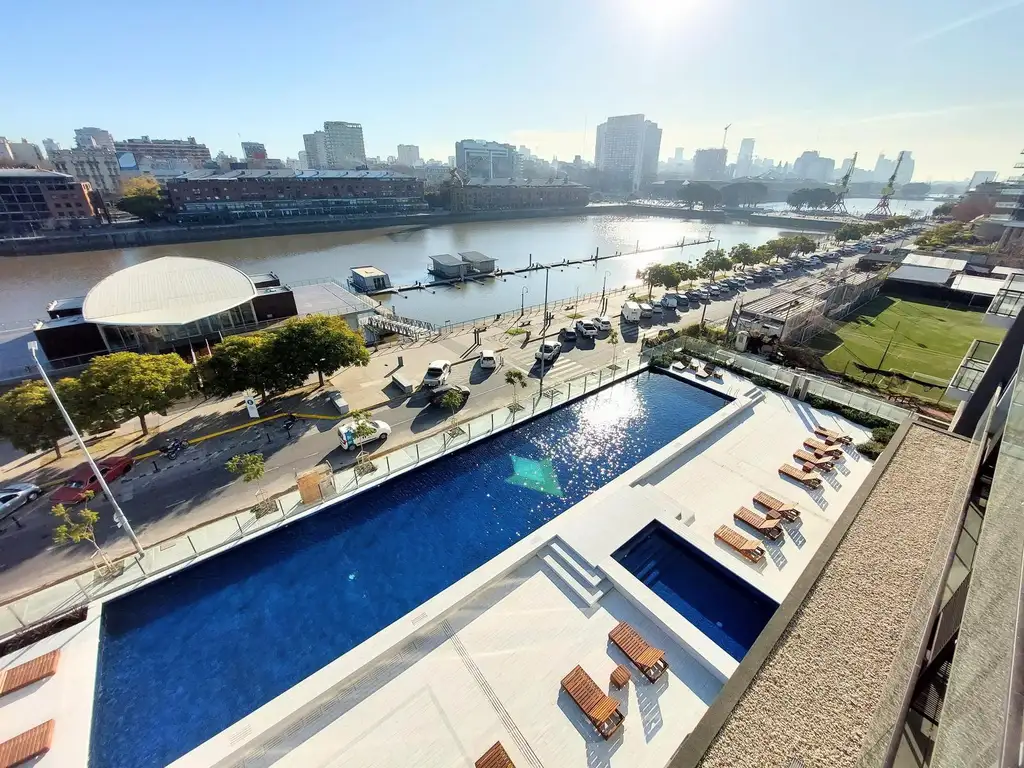 Cuenta con 2 dormitorios en suite con baño y vestidor, toilette de recepción y cocina integrada al living-comedor. Increíble terraza con balcón corrido al frente con hermosa vista del Dique 1 y de la Ciudad de Bs. Aires.