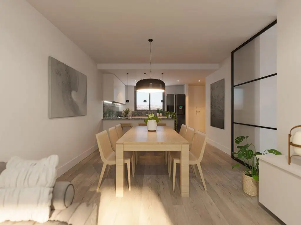 El corazón del hogar es un generoso estar comedor que se fusiona con una moderna cocina integrada. Este ambiente principal se abre a un amplísimo balcón que recorre todo el frente de la unidad, convirtiéndose en un espacio exterior ideal para el descanso o el encuentro. La distribución es inteligente y cómoda: la unidad ofrece dos dormitorios, uno de ellos configurado como una suite principal con baño privado, además de un baño secundario completo.