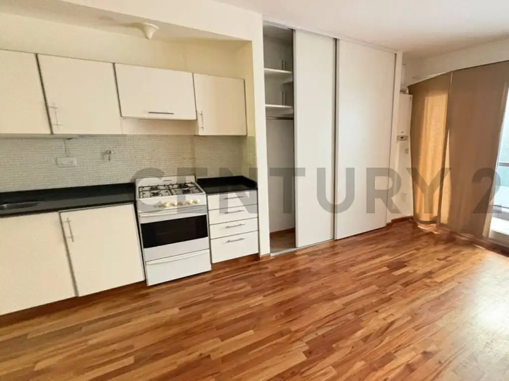 Ambiente con pisos de madera entablados, cocina integrada con alacenas y bajo mesada y cómodo balcón.