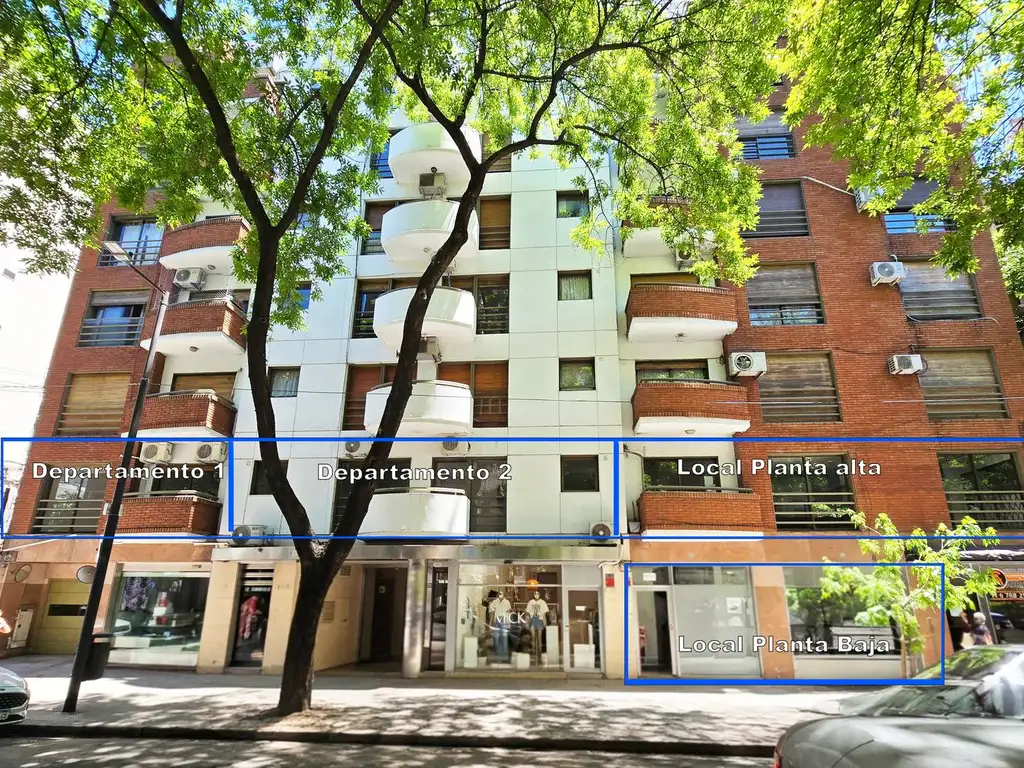 En planta alta, con 130 m2 cubiertos más balcones, todo al frente y con gran luminosidad, hoy se desarrolla en dos departamentos de 2 ambientes completamente renovados, ambos con acceso independiente desde el edificio, más un sector conectado con el local.