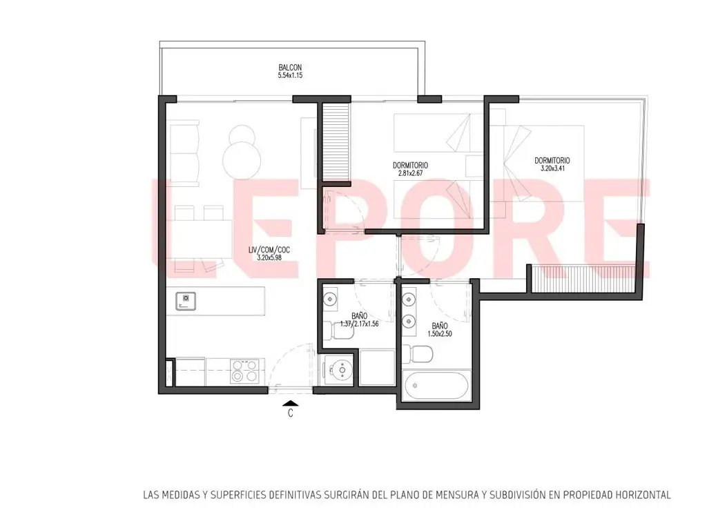 LEPORE Propiedades S.A. CUIT : -9 C.U.C.I.C.B.A. Matrícula Nº 931 (Sucursales Caballito - Palermo - Centro) Nota: Los materiales y especificaciones del plano están sujetos a modificaciones arquitectónicas y otras a la sola discreción del desarrollador, constructor o arquitecto, o que así se requiera por ley. Los planos de planta pueden no ser a escala. Cualquier mueble, electrodoméstico o artículo de decorado representado aquí se muestra únicamente con fines artísticos e ilustrativos y no está incluido en la compra y venta de la residencia. Las dimensiones indicadas se miden a los límites exteriores de la pared exterior y la línea central de las paredes interiores y, de hecho, varían de las dimensiones que se determinarían mediante el uso de la descripción y definición de la "unidad" que se establece en la declaración (que generalmente sólo incluye el espacio aéreo interno entre las paredes perimetrales y excluye los componentes estructurales interiores). Además, las mediciones de habitaciones establecidas en cualquier plano de planta se toman generalmente en los mayores puntos de cada habitación determinada (como si la habitación fuera un rectángulo perfecto), sin tener en cuenta las salidas del corte. En consecuencia, el área de la habitación real será típicamente menor que el producto obtenido multiplicando la longitud por la anchura declarados. Todas las dimensiones son aproximadas y todos los planos y planes de desarrollo están sujetos a cambios. Representaciones orales no pueden considerarse como correctas declaraciones del desarrollador. Propiedad según Ley 5115 La accesibilidad para las personas con discapacidades físicas. "accesible".