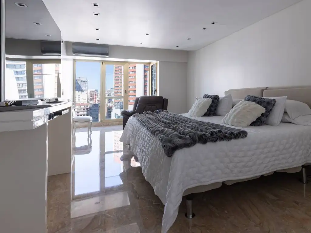 Living y comedor con salida a una amplia terraza al frente, con cerramientos doble vidrio, toldos y cortinas automatizadas. Toilette de recepción, amplia sala o estar con salida a segunda terraza, cuarto principal en suite y con vestidor, y dos cuartos más, uno de ellos en suite.
