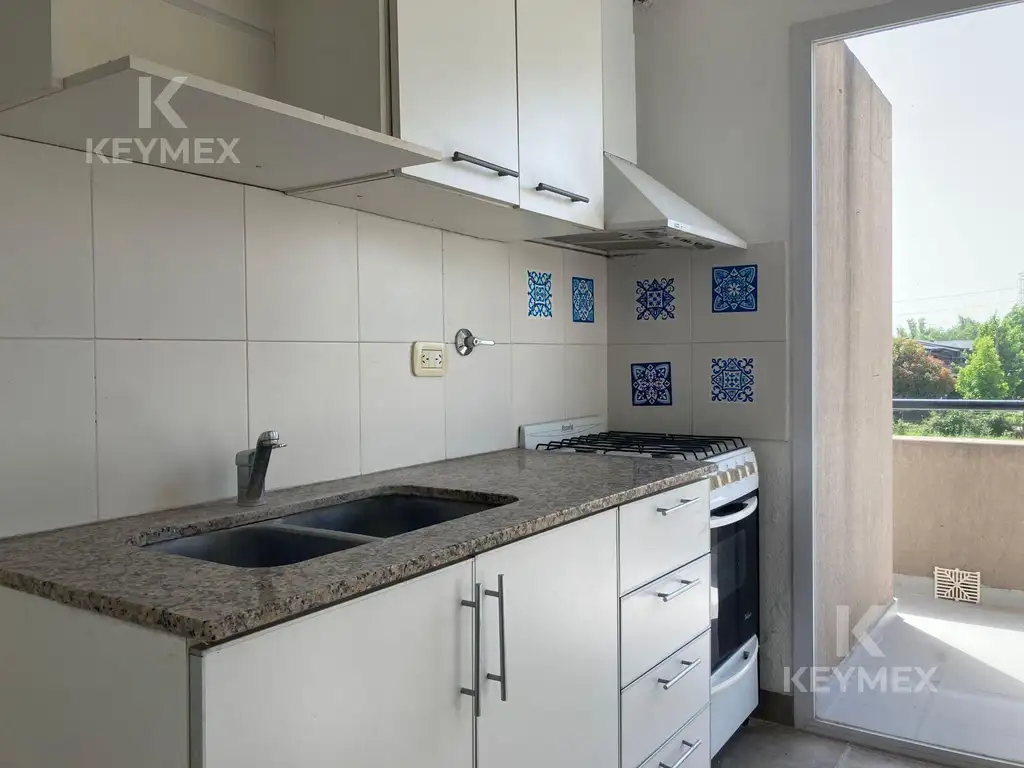 - Cocina con muebles de melamina, espacio para heladera, cocina con horno y extractor de aire