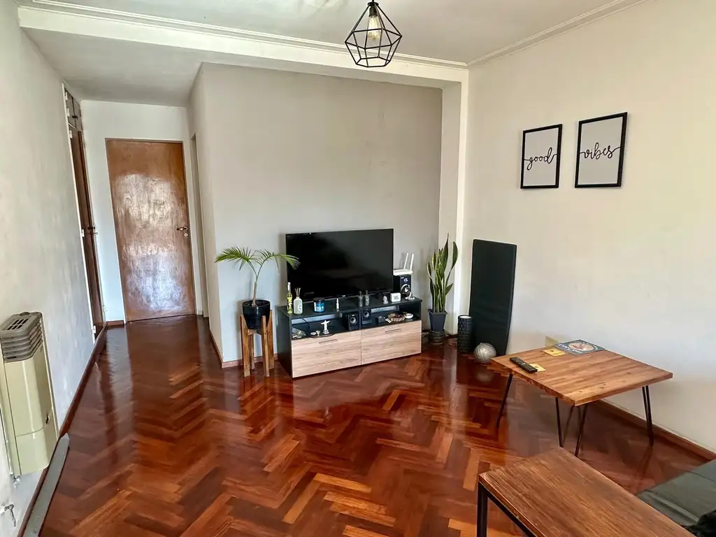 TERMINACIONES: Pisos de parquet hidrolaqueado en living comedor, pisos ceramico nuevos en dormitorio, mesada de granito, horno y cocina a gas, alacenas y bajo mesada completa, baño con ducha, sanitarios completos, pisos ceramico en cocina. Aire acondicionado de pared en dormitorio, y calefactor en el living.