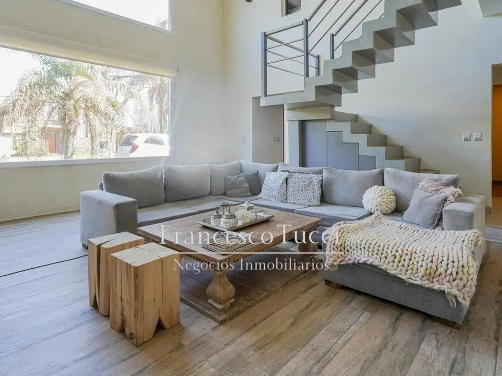 En planta baja, encontramos un office, hall de distribución, toilette, gran cocina totalmente equipada, living de doble altura y comedor formal que se conecta con la gran galería con vista al fondo. También, un gran sector de garaje para dos autos cubiertos, un cuarto de guardado y lavadero, una gran piscina, un lote de fondo libre y grupo electrógeno.