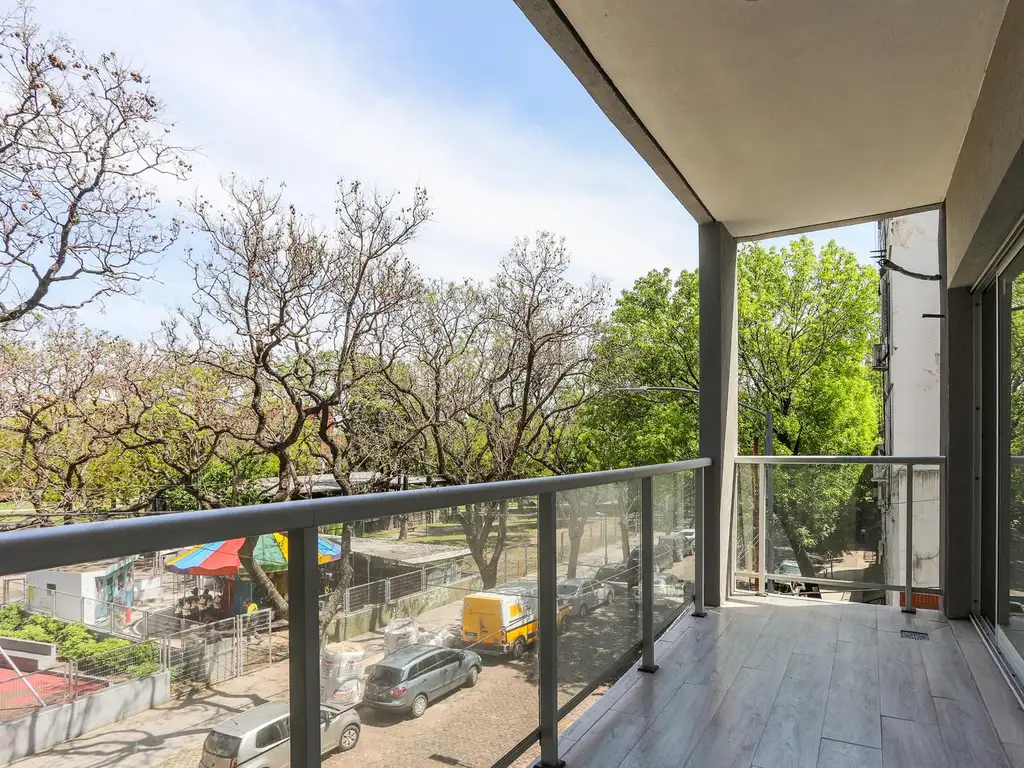 Balcón al frente de 6 metros, gran vista a la plaza Martin Fierro, barandas con perfiles de aluminio y frente de vidrio 3+3 con laminado de seguridad. Pisos revestidos con cerámicos